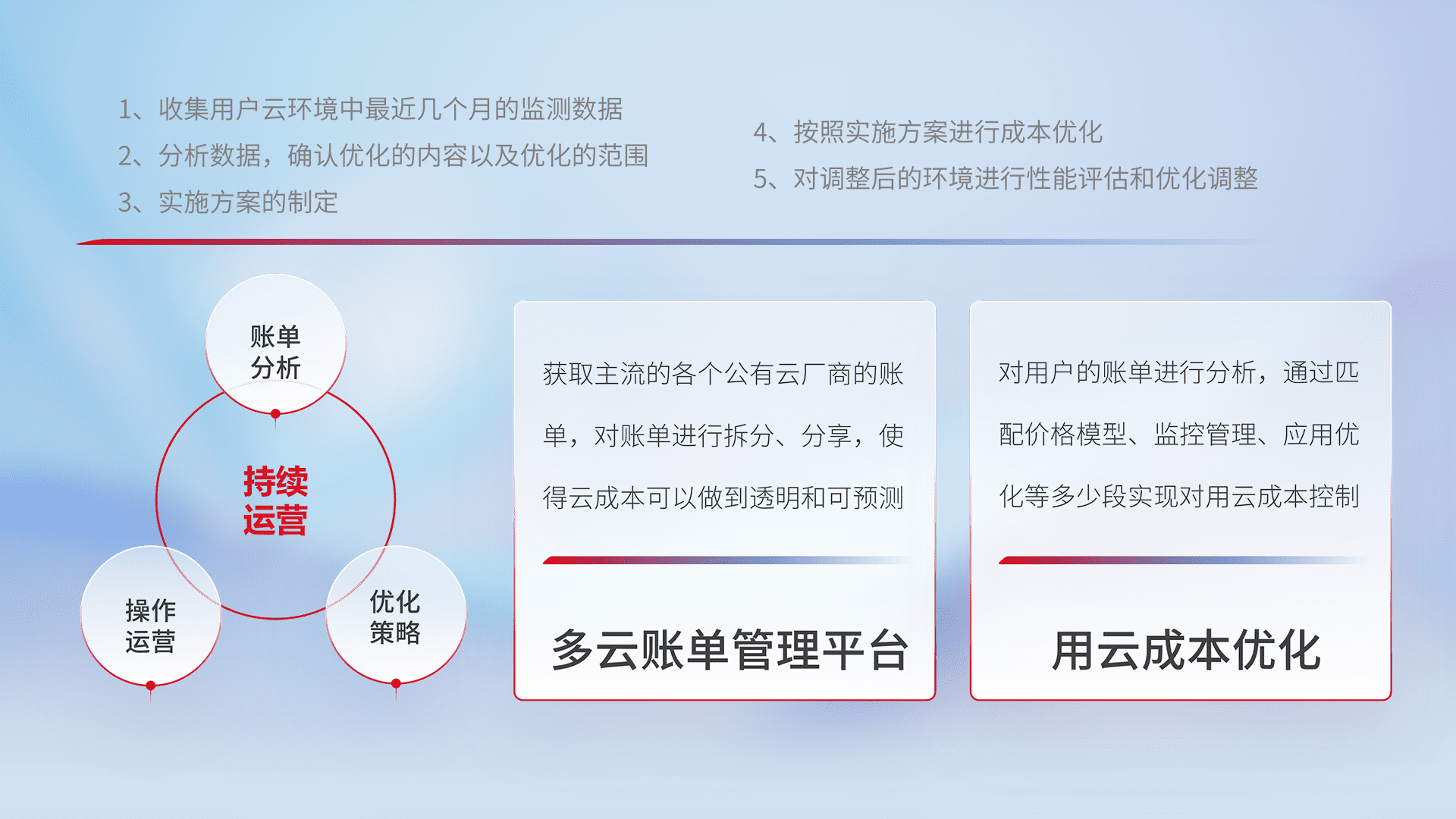 通过多云纳管,,,,以统一的资源数据模型把客户的云资源进行抽象和封装,,进而实现对多云资源的统一操作,,保障云资源管理的可靠性、、、、稳定性与可用性。。。量身定制化运维内容,,配置、、开发运维、、、补丁管理、、、、备份、、监控、、认证和访问管理、、、审计和日常巡检等,,保障在用云过程中的可靠度,,,稳定度以及高可用率。。。。